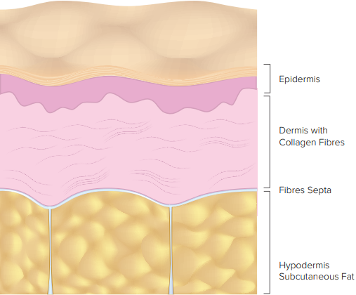 In medical terms, cellulite forms when pockets of fat squeeze between bands (Septa – a thin wall or membrane that separates two parts) of tissue under the skin (Epidermis – top layer). These bands (Fibres Septa), are designed to hold fat in place, however depending on genetics, fat cells can squeeze between the fibres septa, creating a lumpy ‘dimple’ look. From a medical perspective, men rarely have cellulite, this is because for men the bands of skin tissue – septa, that keeps the subcutaneous fat in place are in a criss-cross pattern, making them stronger than those in women, whose Fibres Septa run in parallel lines.