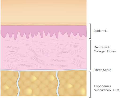 Layers of skin tissue unaffected by fat cells pushing between the fibres septa.